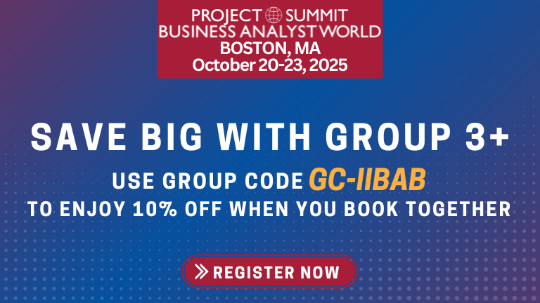 Join other business analysts at Project Summit Business Analyst World Boston, MA October 22 - 25. Special Discount for IIBA Members
